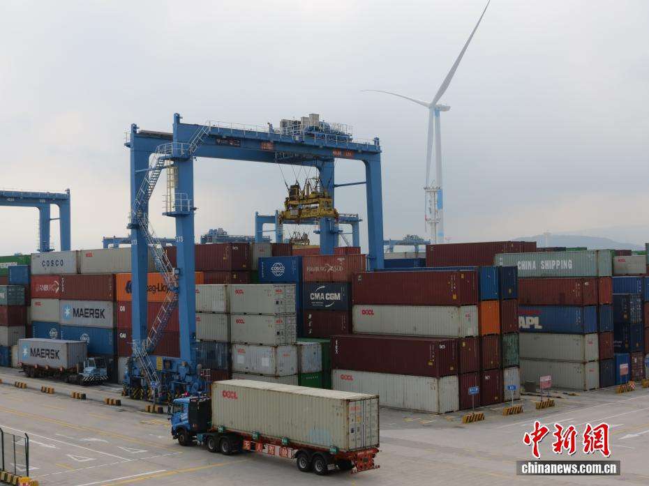 8月4日,在宁波舟山港梅山港区,塔吊林立,港区集卡穿梭其间。当日,“活力中国调研行”浙江主题采访团走进宁波舟山港梅山港区,探访世界第一大港的智慧化和绿色港口建设。(图片来源:中新社)