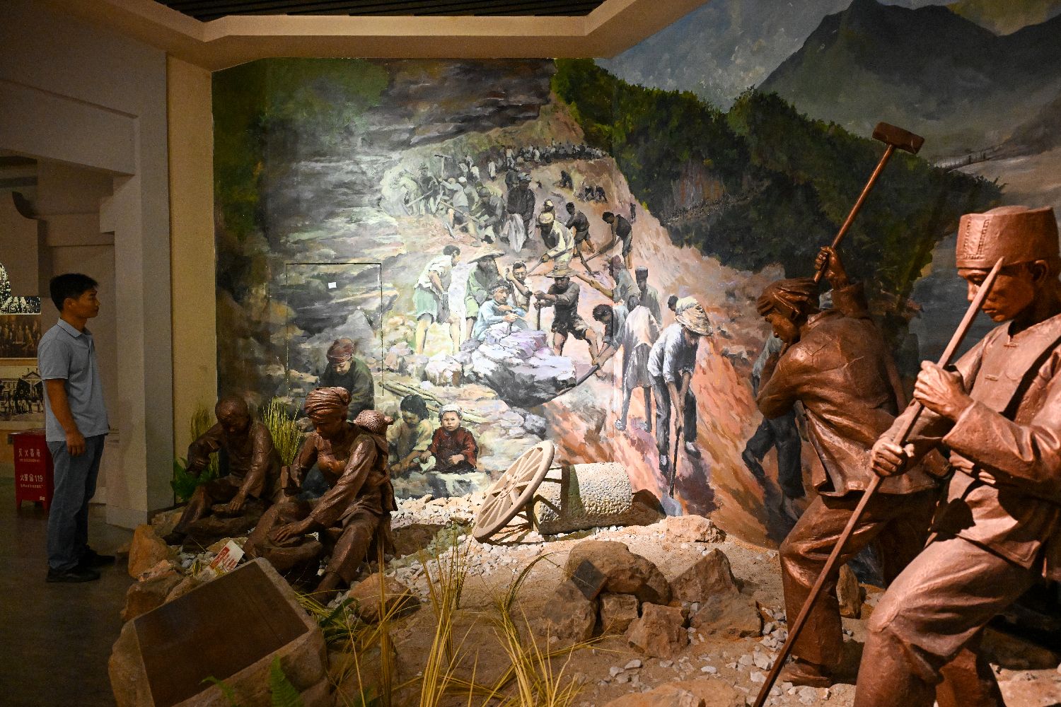 观众在位于云南省德宏傣族景颇族自治州瑞丽市畹町镇的南洋华侨机工回国抗日纪念馆观看修筑滇缅公路复原场景。