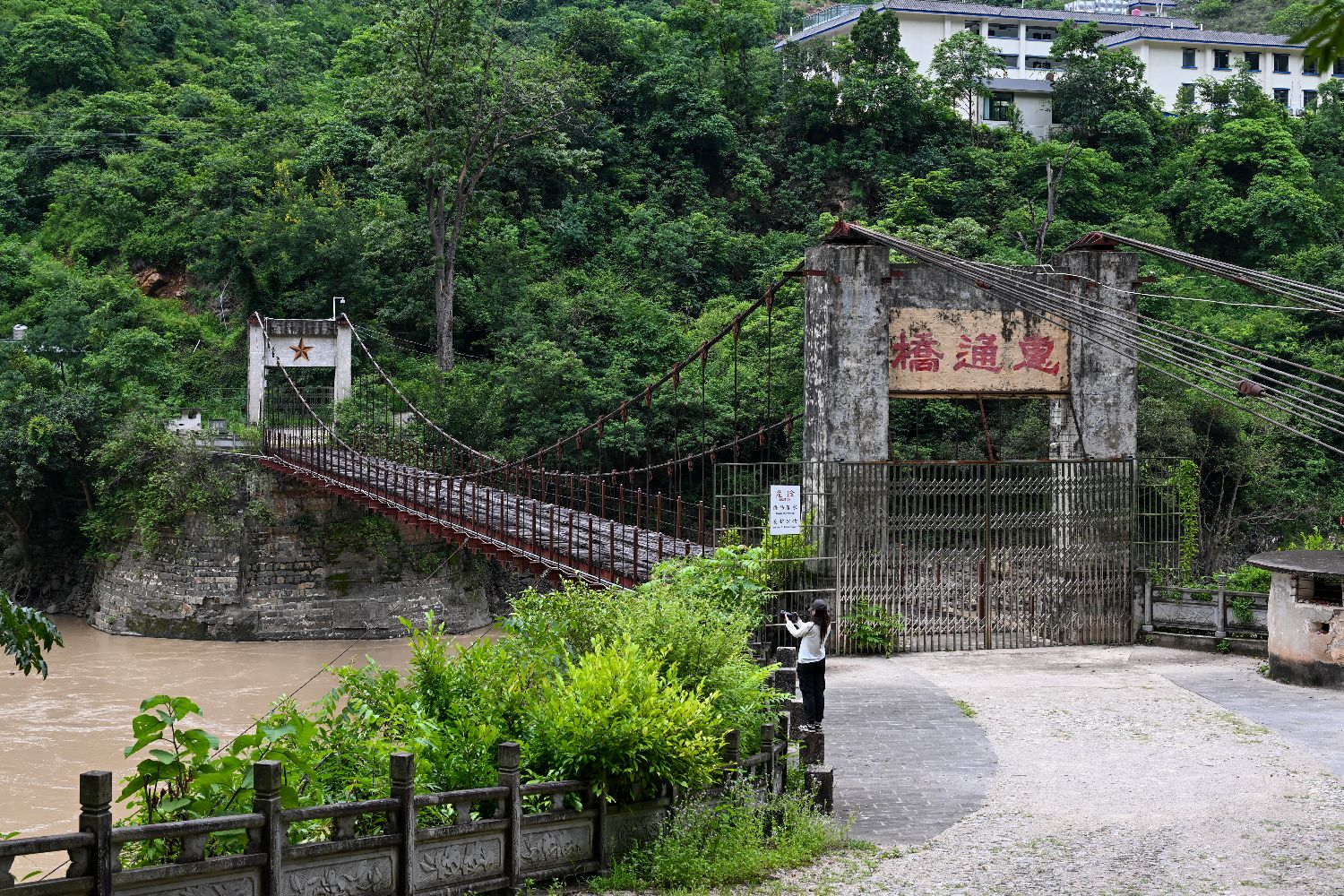 游客在惠通桥遗址参观拍摄。惠通桥是滇缅公路的咽喉要道,连接云南怒江东西岸的保山和龙陵,被誉为“抗日功勋桥”。