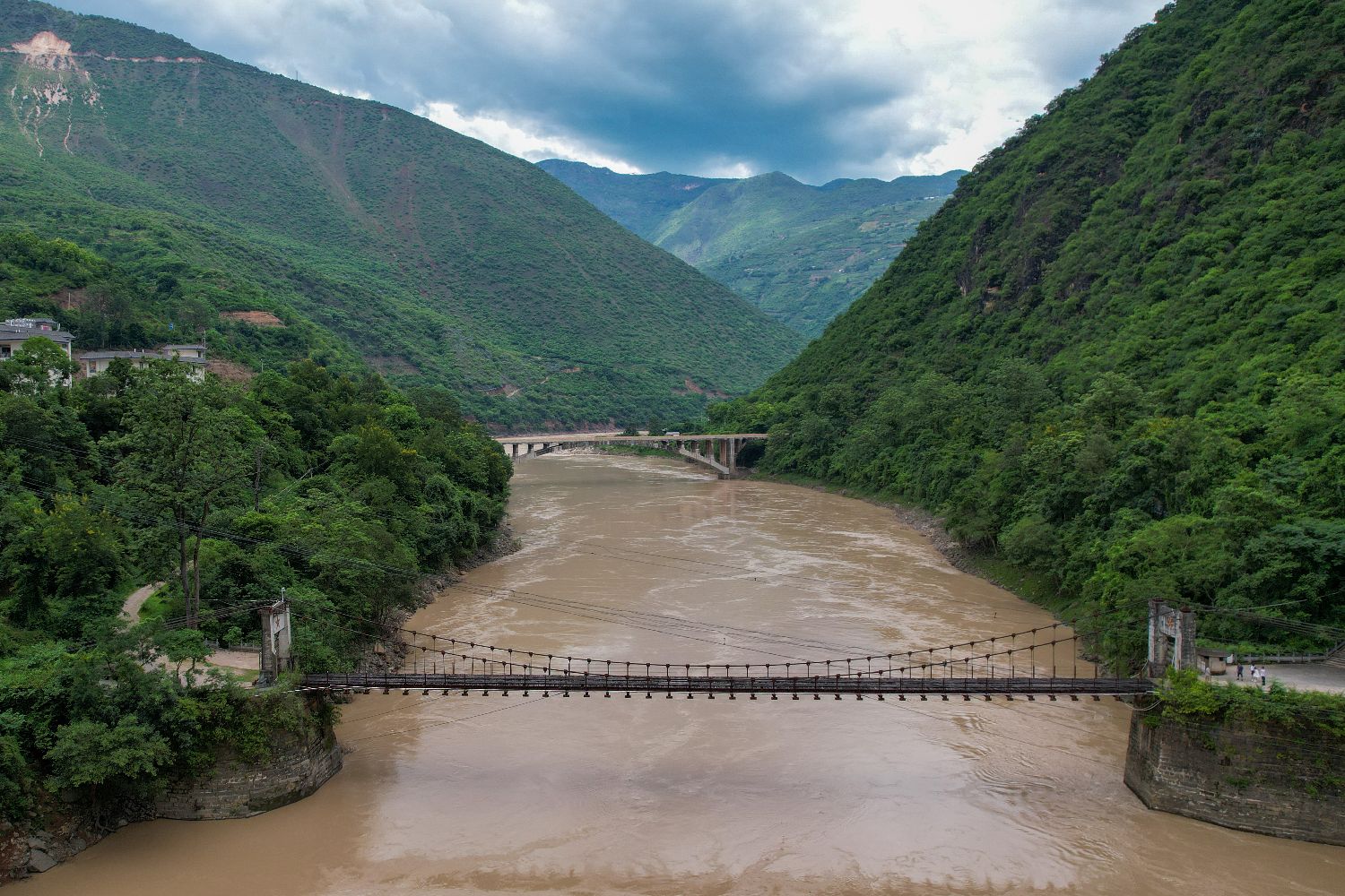 航拍横跨怒江的惠通桥遗址。惠通桥是滇缅公路的咽喉要道,连接云南怒江东西岸的保山和龙陵,被誉为“抗日功勋桥”。
