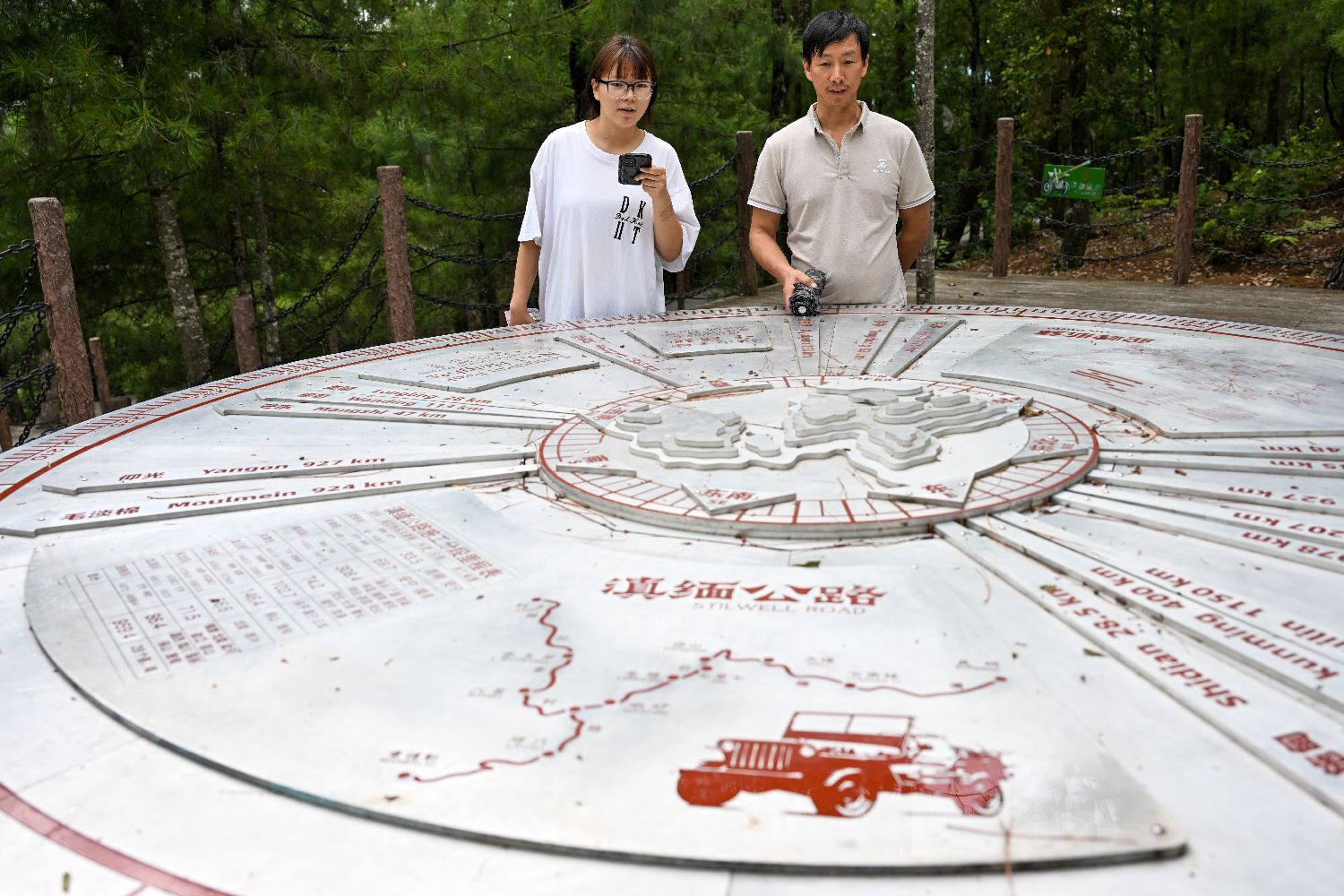 游客在云南省保山市龙陵县松山观看滇缅公路路线图。