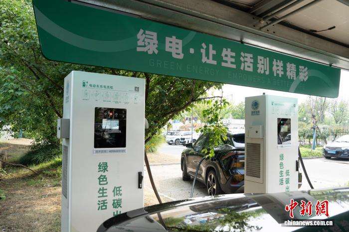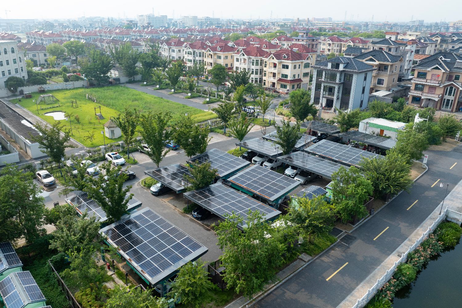 8月4日,顶部安装光伏面板并配备充电桩的梅林村公共停车场。(图片来源:中新社)