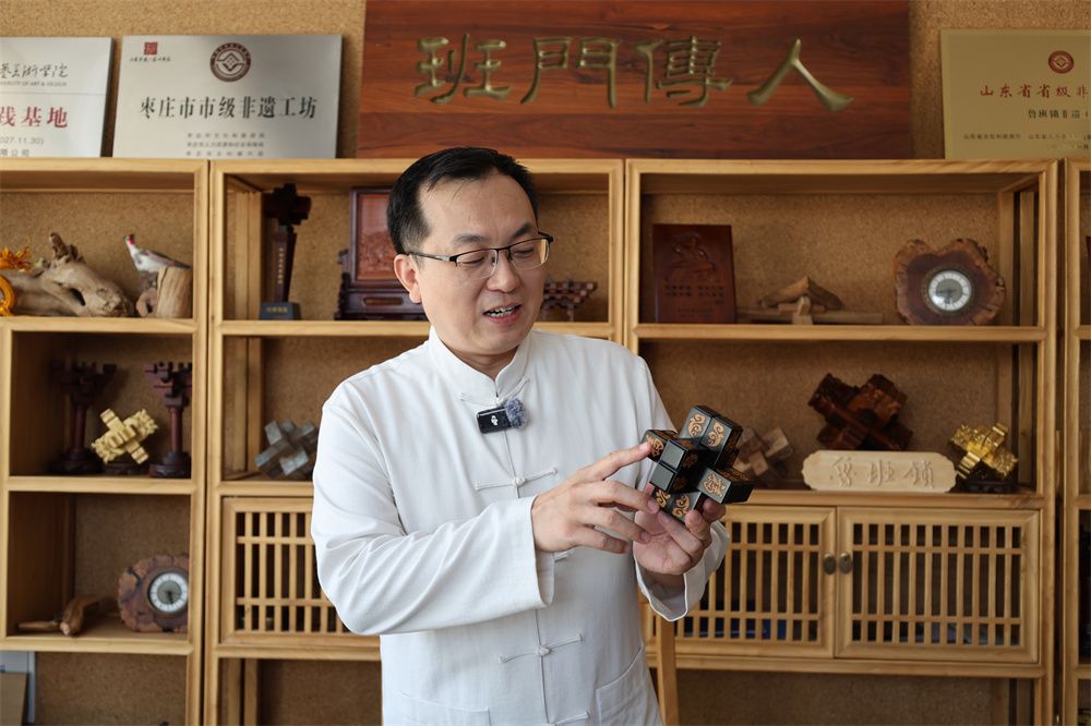 在当代,鲁班智慧正焕发新的生机。走进山东省级非物质文化遗产鲁班锁制作技艺代表性传承人李浩的工作室,六柱鲁班锁、九柱鲁班锁在阳光里流转着琥珀色的光晕。
