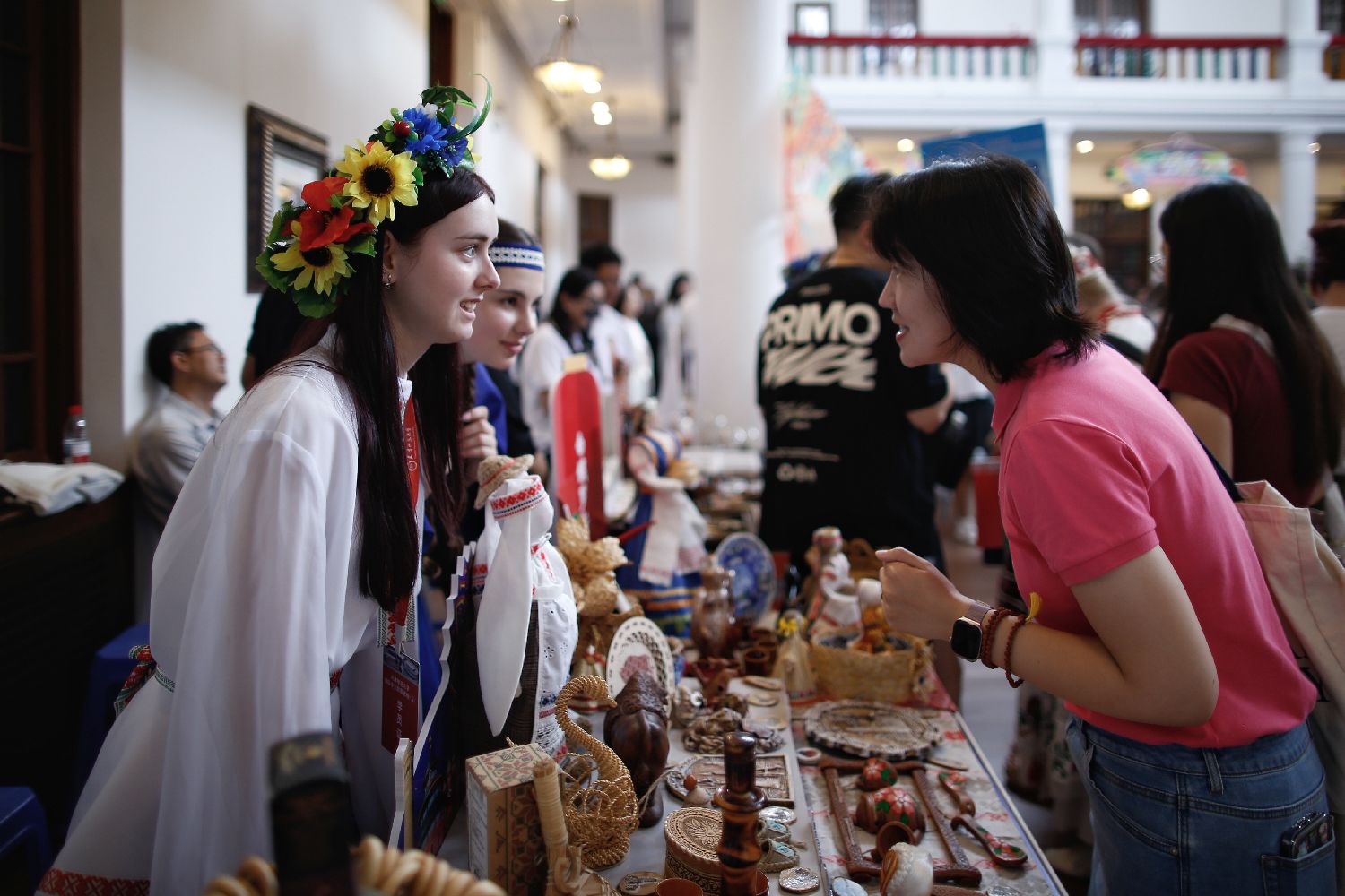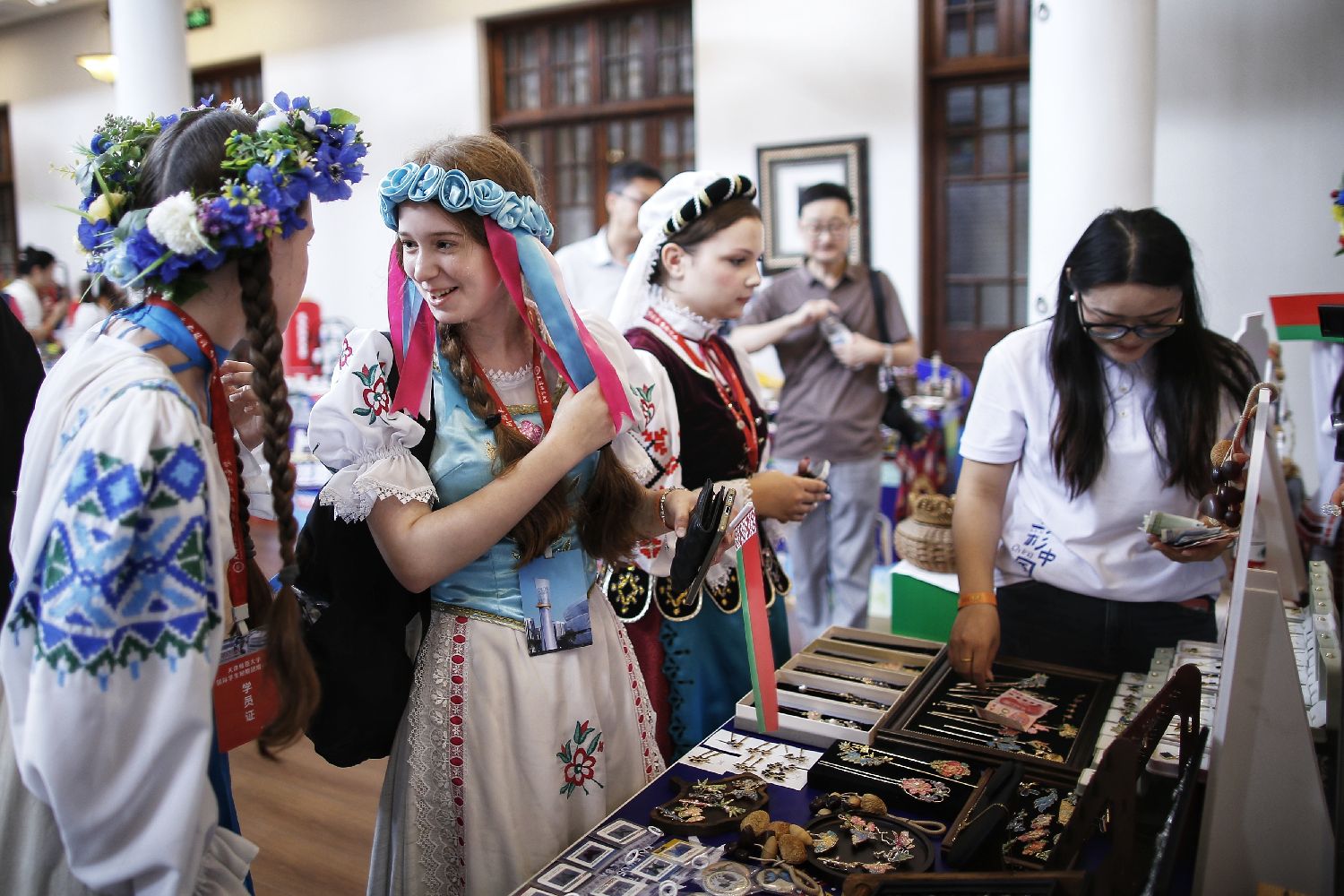 来自上合组织国家的数十名青年学子在市集上“摆摊设点”,用极具各国特色的展品讲述家乡故事,推动文明互鉴。图为8月6日,来自上合组织国家青年学生在中华传统技艺饰品展位参观。