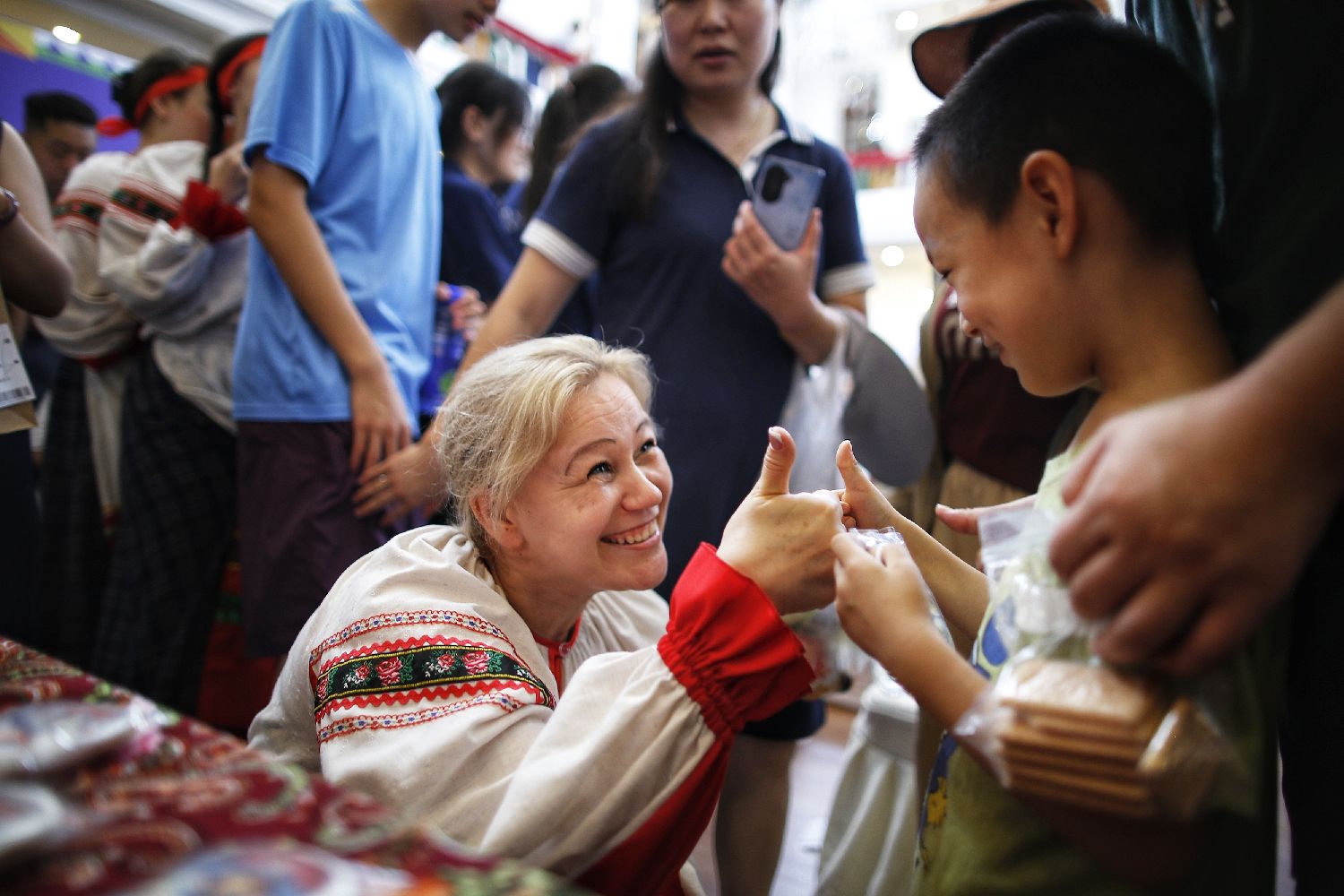 8月6日,来自莫斯科国立文化学院教授斯韦特兰娜在俄罗斯展位前与参观的小朋友互相点赞。