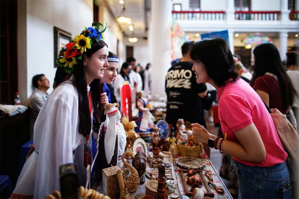 8月6日,上合国家青年学生“万花筒”文化市集天津开集。图为嘉宾在白俄罗斯展位参观。(图片来源:中新社)
