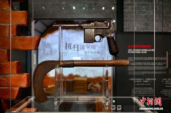 图为东江纵队港九独立大队成员曾使用的毛瑟M712速射型手枪(上)及镰刀。