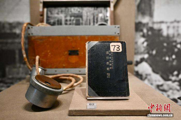 图为日军曾使用的九二式电话机(野战电话)及通讯兵训练手册《通讯教范》(右)。