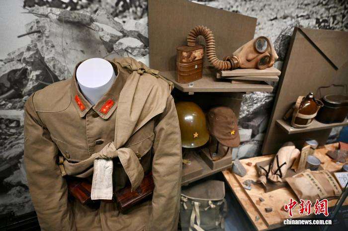 图为日本陆军二等兵军服(左)及1号甲型防毒面具(上)等。