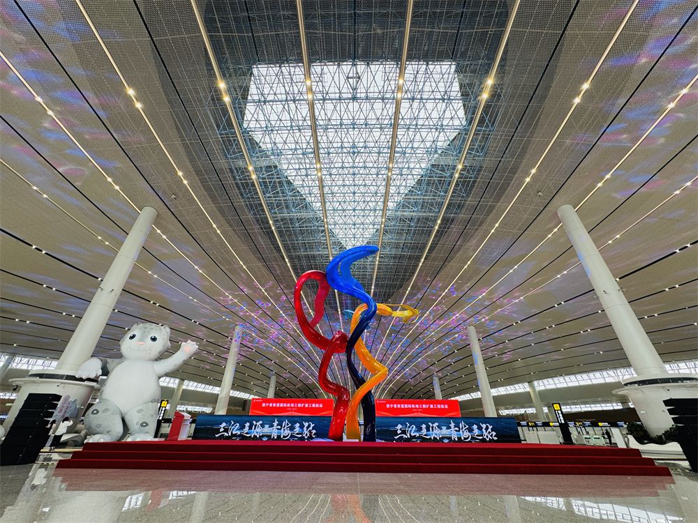 俯视西宁机场新建T3航站楼,其外观形似高原精灵——黑颈鹤呈展翅飞翔之姿。航站楼出发大厅内,三条指廊寓意“三江汇聚”,航站楼主景观“中华水塔”由三条蜿蜒起伏飘带构成,并设置景观雕塑、雪豹气模区,《唐蕃古道》等墙面艺术作品。