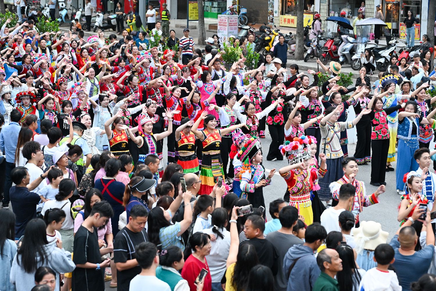 第二十二届南华野生菌美食文化节8月7日在云南省楚雄彝族自治州南华县举行,民众齐聚街头同跳“阿苏嗻”,展现多彩民族风情。
