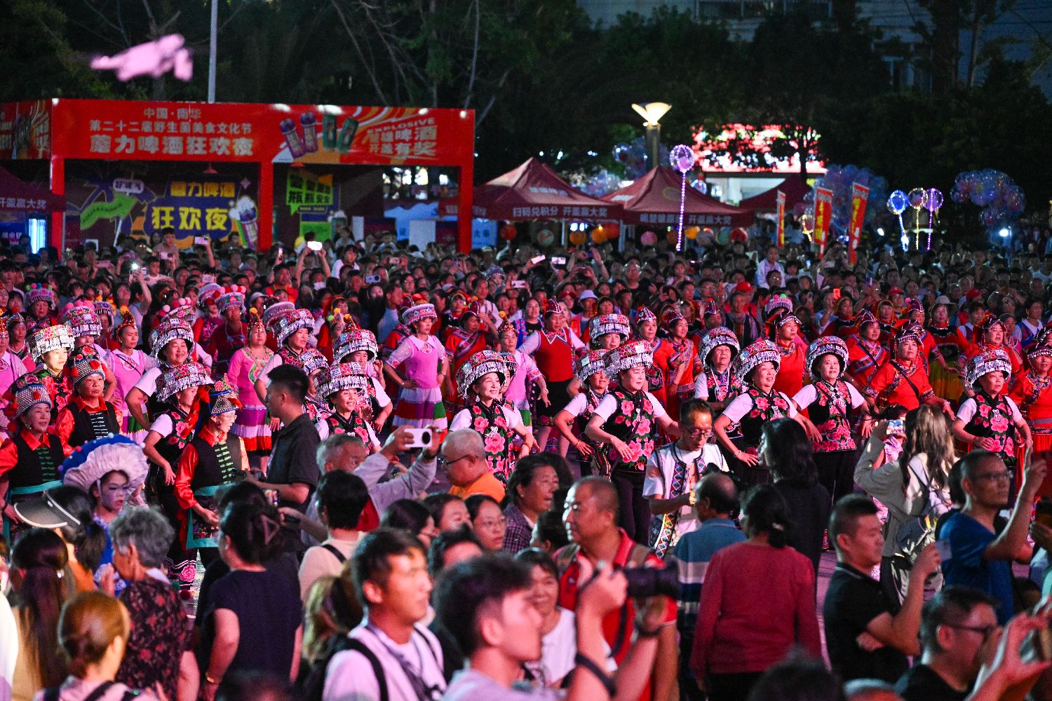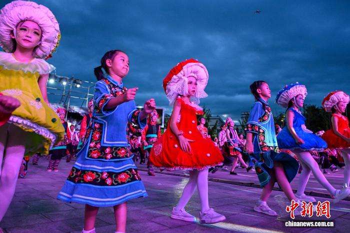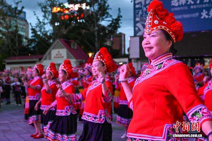 8月7日晚,第二十二届南华野生菌美食文化节在云南省楚雄彝族自治州南华县举行,民众齐聚街头同跳“阿苏嗻”,展现多彩民族风情。(图片来源:中新社)