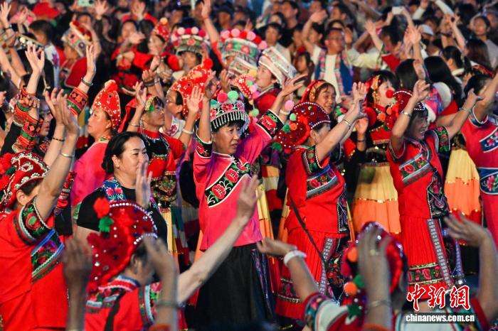 “阿苏嗻跳歌调”这一跳唱曲步是结合了南华大三弦舞、纵歌、直歌、闪闪歌的当地传统民族歌舞。(图片来源:中新社)