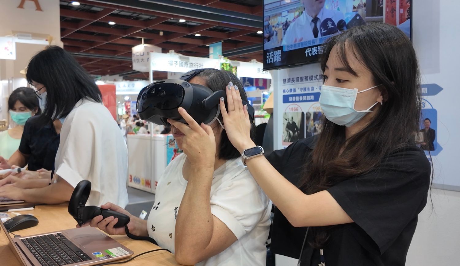 8月9日,台湾第二届高龄健康产业博览会正在台北举行。图为参观民众在佩戴VR眼镜体验中医“望闻问切”。(图片来源:中新社)
