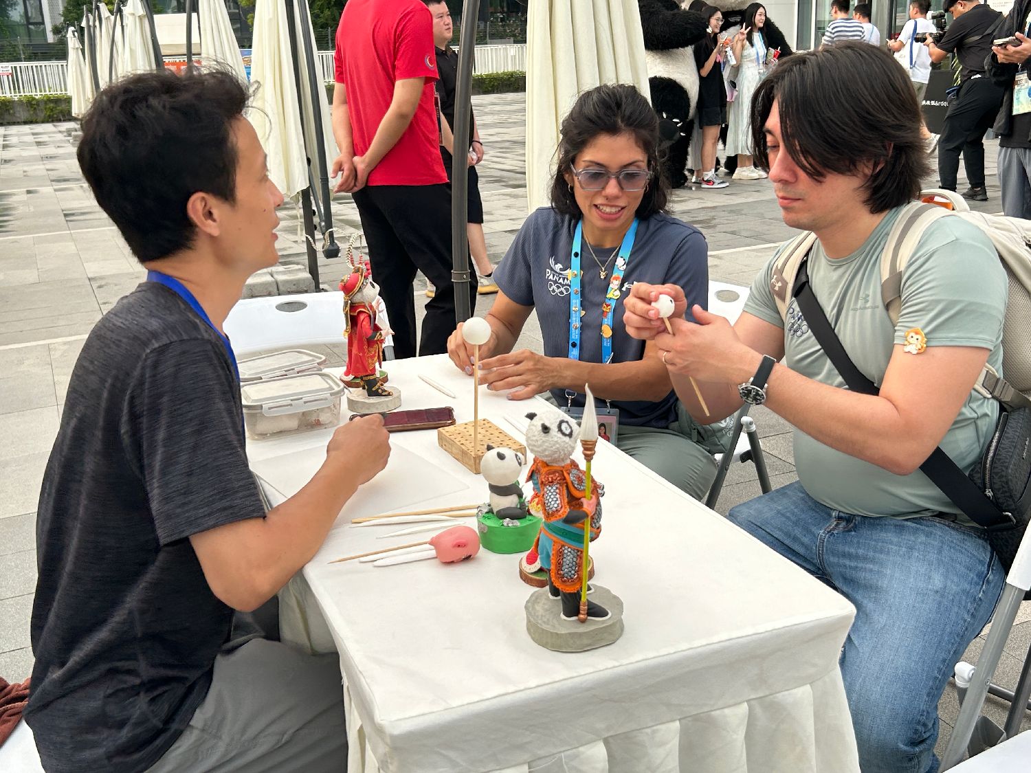 大熊猫的“魔力”随处可见:市集旁,一群运动员正排队和大熊猫玩偶合影;世运村口,几位运动员正与主动交流的成都“小孩哥”交换大熊猫主题纪念徽章;来自巴拿马的运动员阿罗塞梅纳・雅克琳则在捏面人摊位前“拜师学艺”,跟着“四川师傅”学捏大熊猫面人。