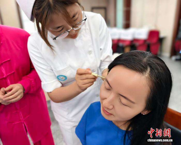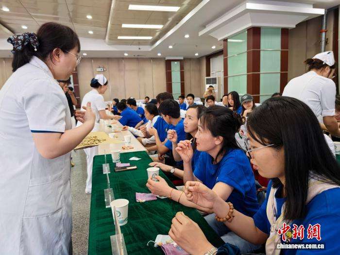 来自美国、英国、德国、西班牙、加拿大、比利时、吉尔吉斯斯坦、哈萨克斯坦8国55名华裔青少年和领队到此辨识常用中草药,制作中药香囊,品尝中药代茶饮,练习八段锦,体验杵针、耳穴压豆、推拿、点穴,感受中医药的博大精深。(图片来源:本文图片均据中新网)