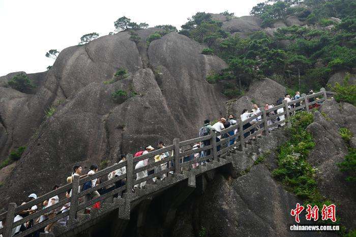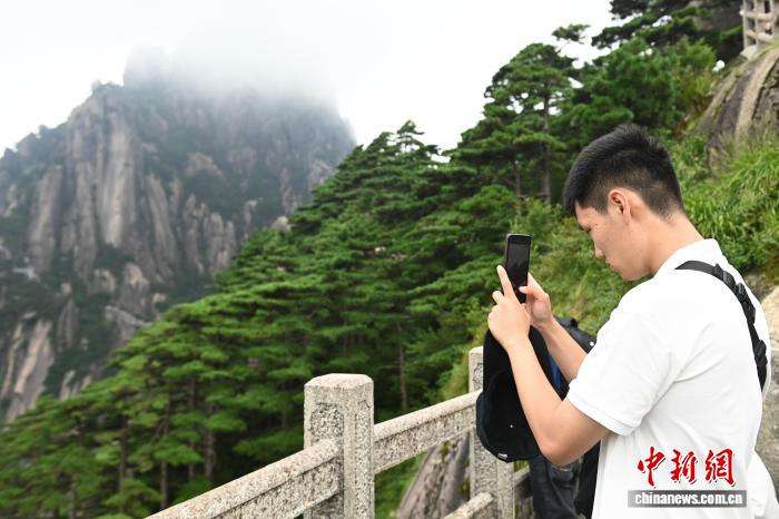 华裔学生漫步在黄山风景区,脚下是蜿蜒的山路,身旁是奇松怪石与缭绕云雾。(图片来源:本文图片均据中新网)