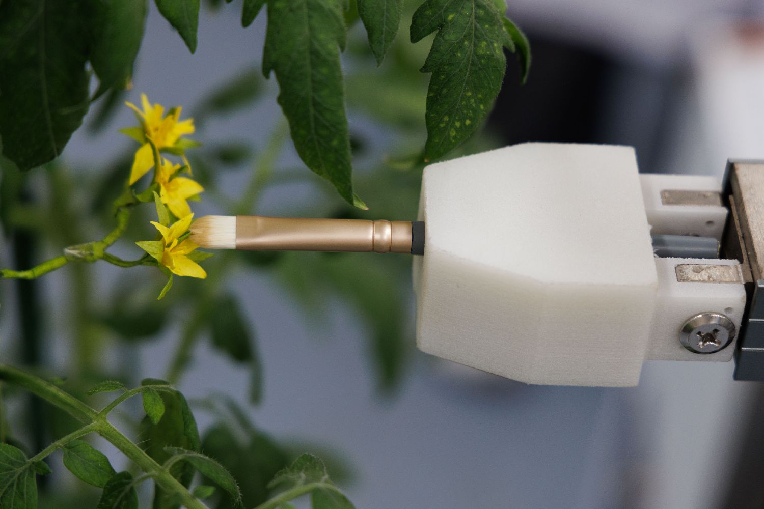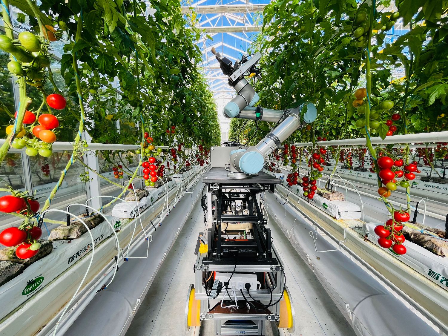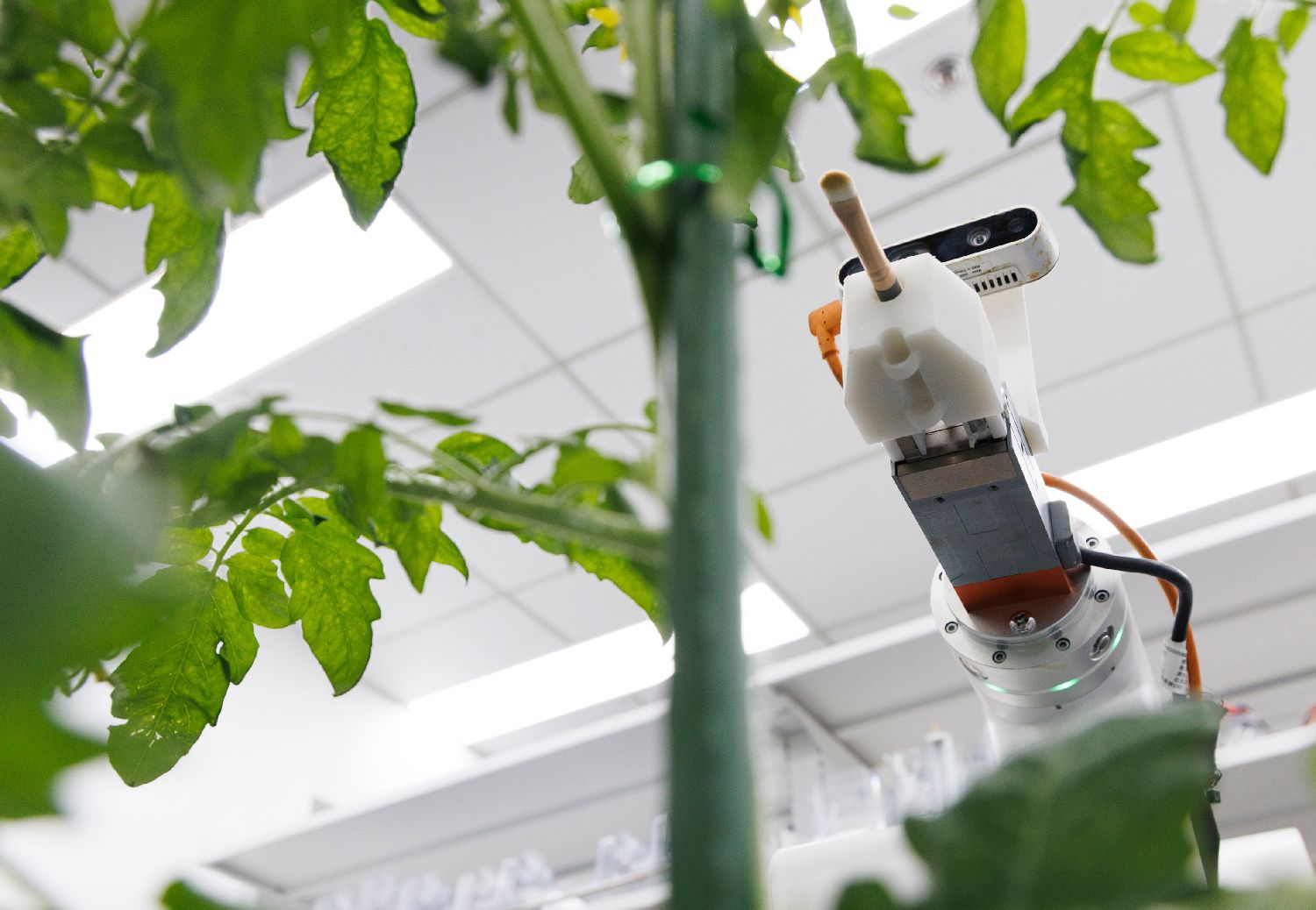 智能育种机器人“吉儿”在位于北京的一个现代化商业温室中进行番茄自动杂交授粉操作(2024年11月29日摄)。(图片来源:本文图片均据新华社)