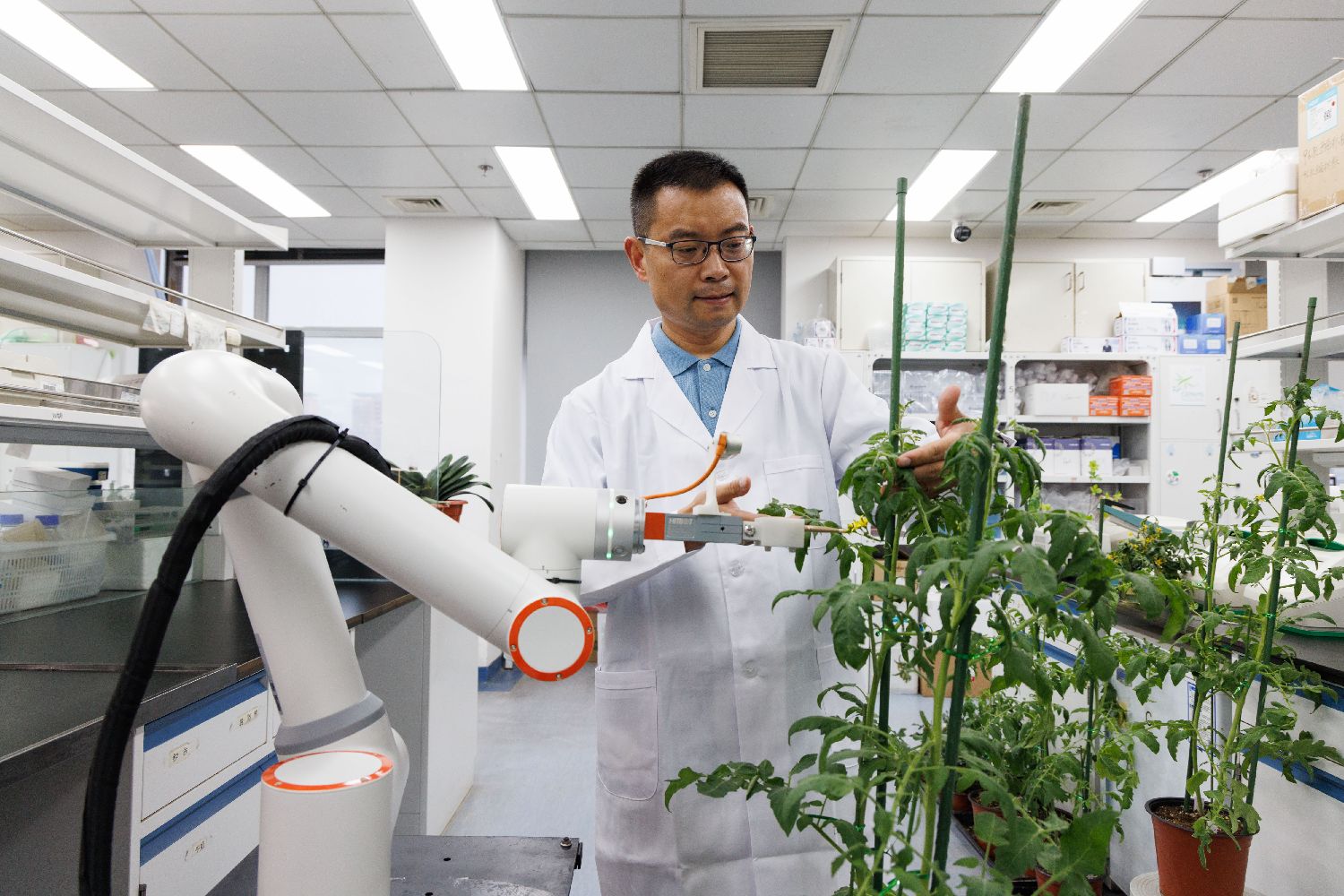 8月12日,在中国科学院遗传与发育生物学研究所实验室,许操研究员在观察智能育种机器人“吉儿”的工作情况。