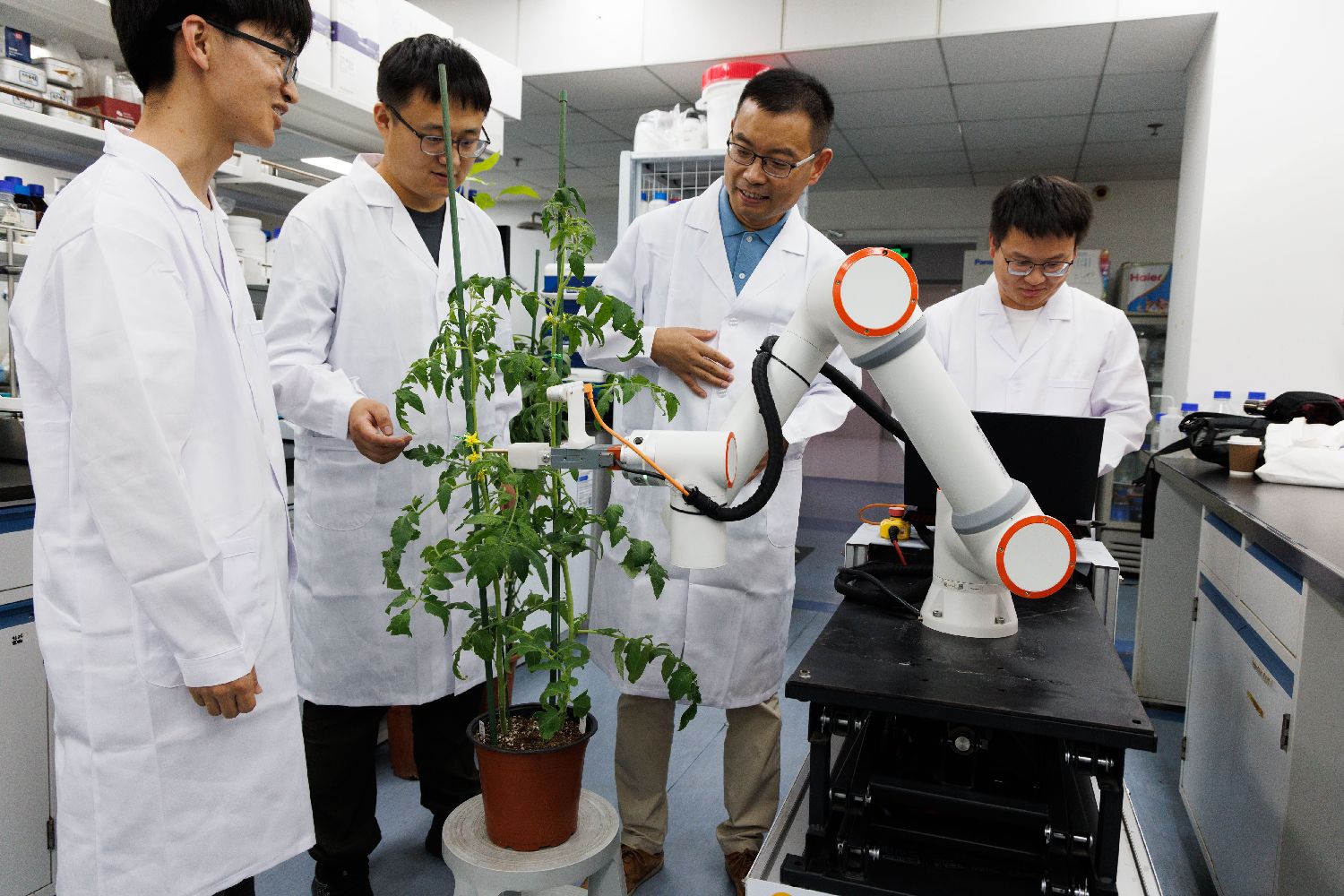8月12日,在中国科学院遗传与发育生物学研究所实验室,许操研究员(右二)和团队成员在调试智能育种机器人“吉儿”。