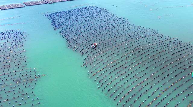 (船行在福建连江黄岐湾生态浮球替换海域)