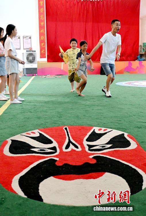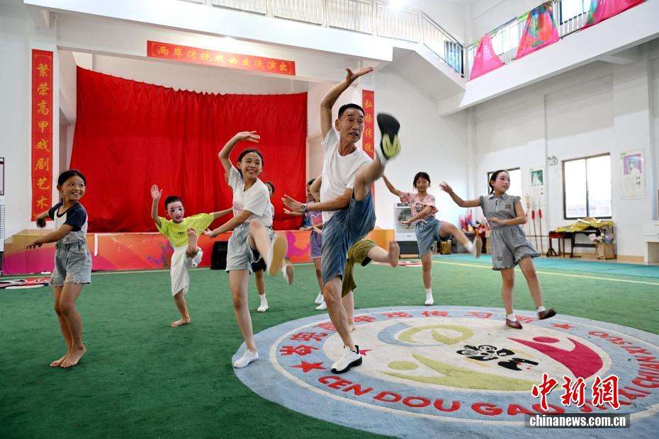 2015年,岑兜村开办高甲戏传习所,招收岑兜小学的学生在课余时间学习高甲戏,并持续至今。图为8月12日,专业高甲戏演员洪德文(中)在福建省南安市岑兜村高甲戏传习所指导孩子们练习基本动作。多年来,洪德文利用业余时间教授传习所的孩子们学艺。面对调皮的孩子、有限的时间,他时常忍不住摇头,却仍希望有更多孩子加入传承高甲戏的队伍。