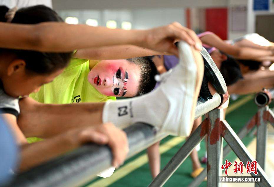 图为8月12日,孩子们在福建省南安市岑兜村高甲戏传习所练习压腿。