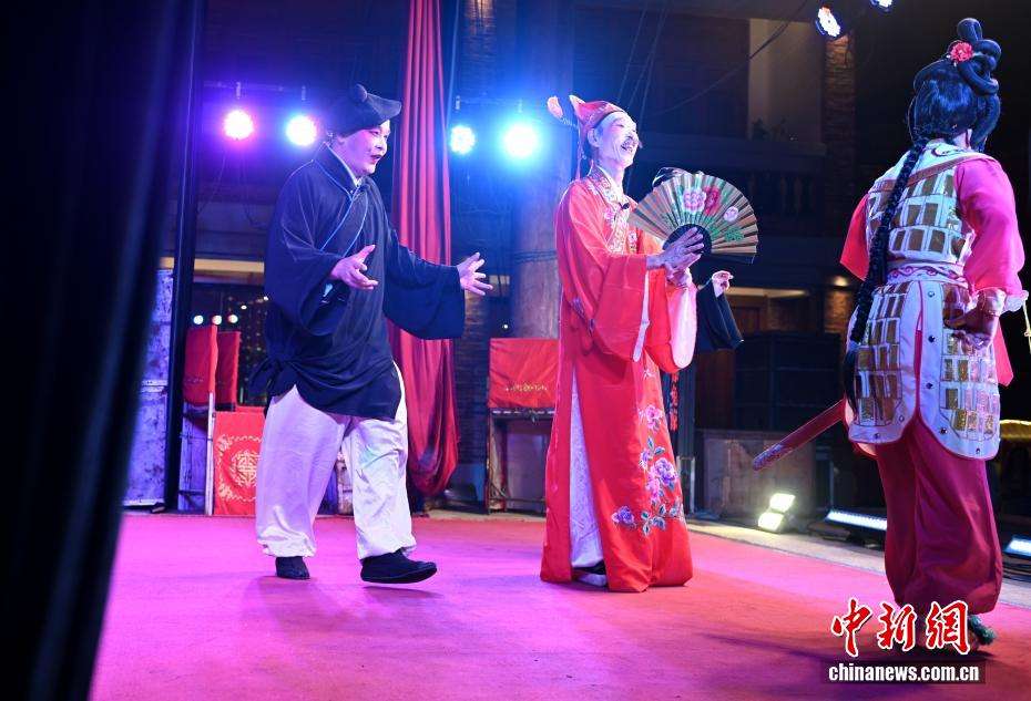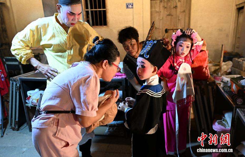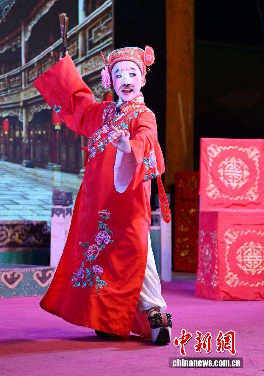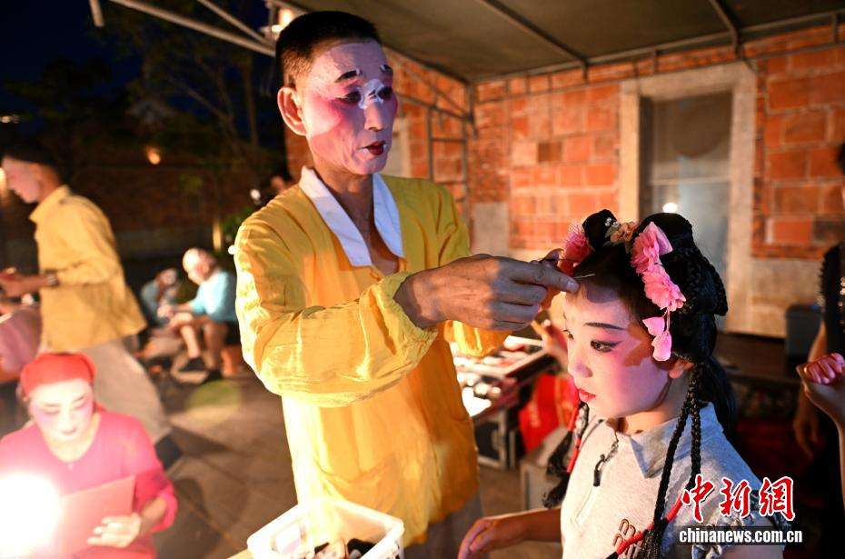 图为8月12日,洪德文(中)在福建晋江梧林传统村落表演。今年62岁的洪德文是土生土长的岑兜人。从艺46年,他见证了高甲戏的起起伏伏,如今依然活跃在舞台上。