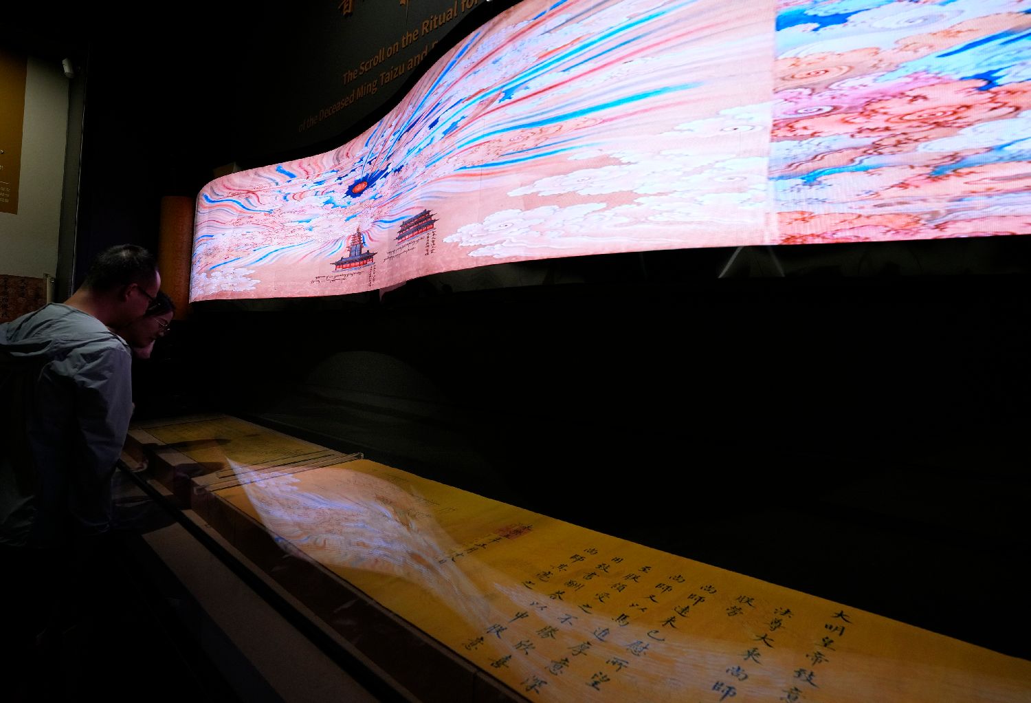 8月5日,观众正在西藏博物馆内欣赏《普渡明太祖长卷图》动态演示图。(图片来源:中新社)