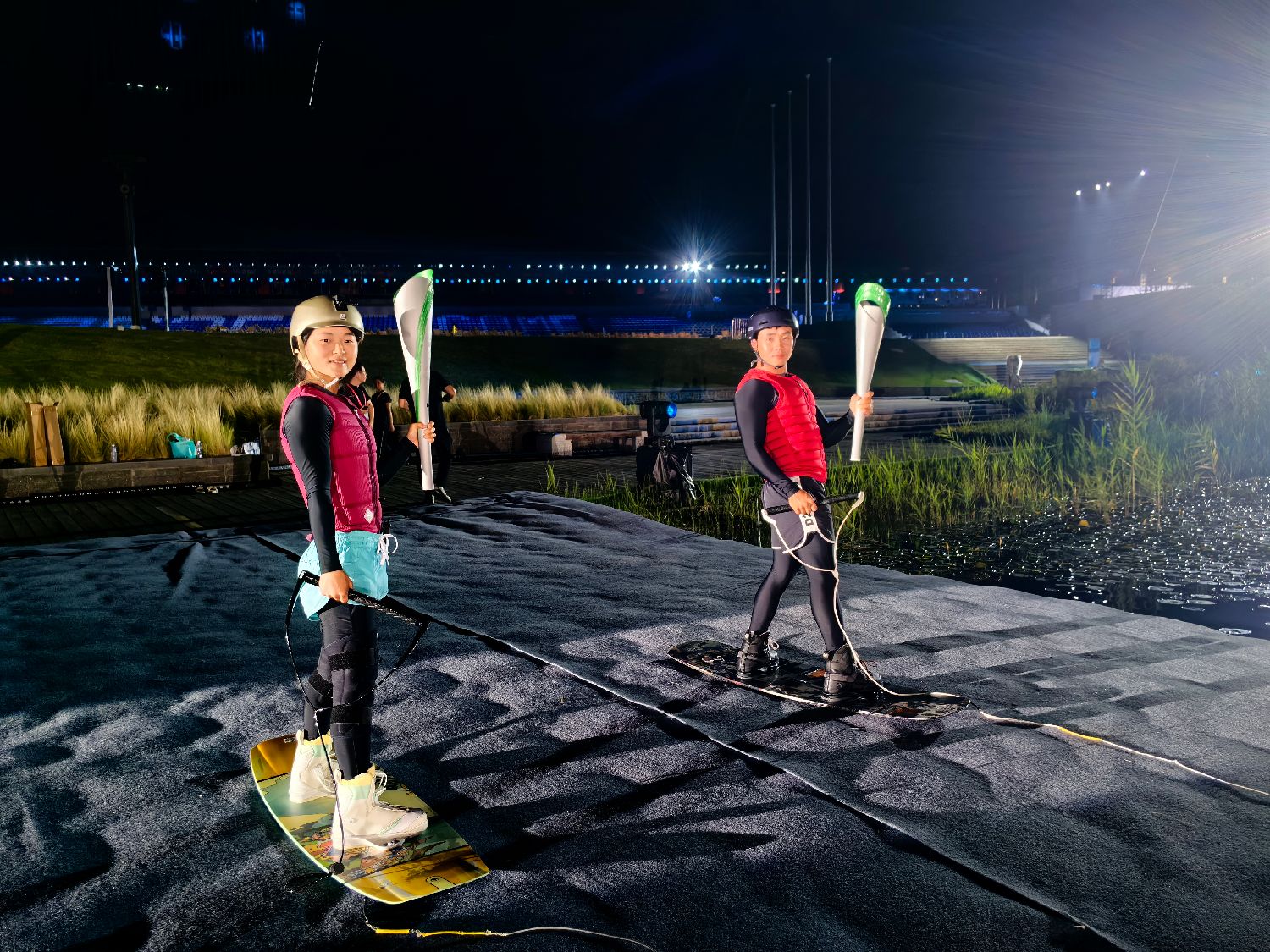 8月3日,徐露(左)与阿卢晓波(右)在成都世运会开幕式彩排现场。(图片来源:受访者供中新社图)