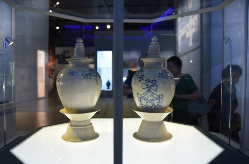 8月13日,河南郑州,河南南水北调博物馆内,中国首次唐代青花瓷专题展“丝路华章——唐代青花瓷瑰宝展”吸引众多游客参观。图为郑州唐墓出土的青花塔式罐。(图片来源:中新社)