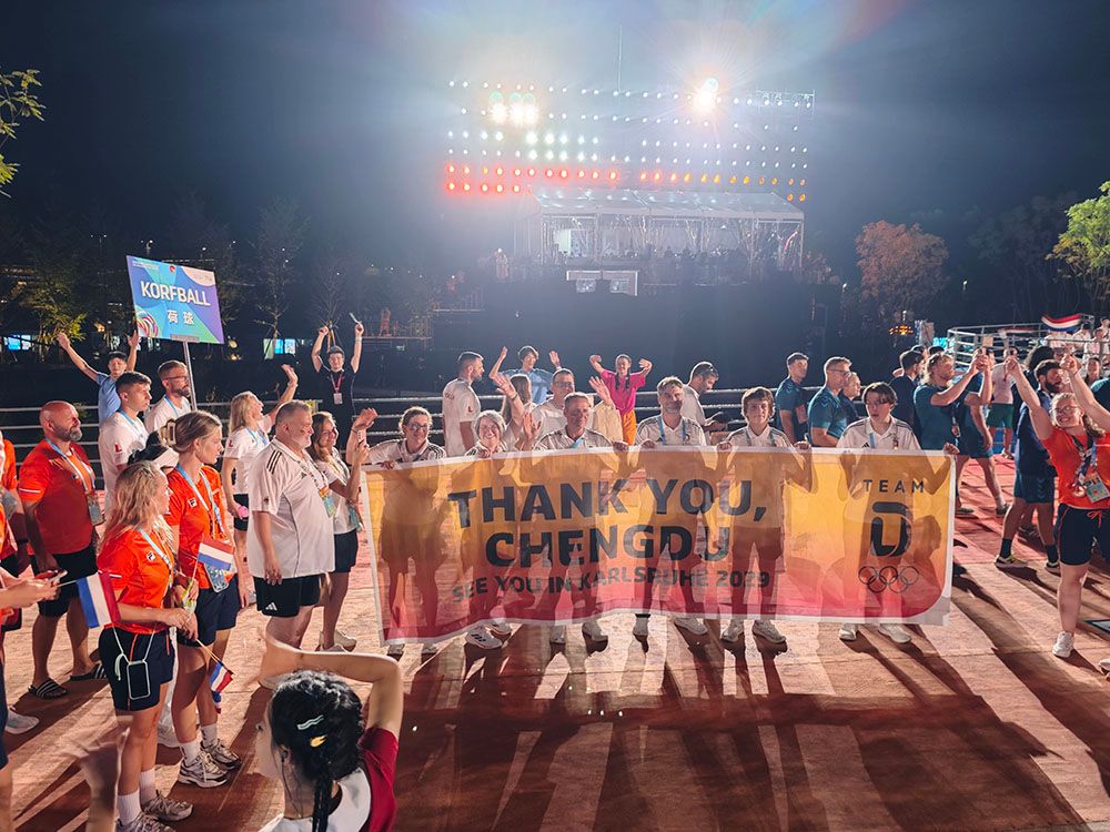 运动员手举“ThankyouChengdu”的横幅。(图片来源:中新社)