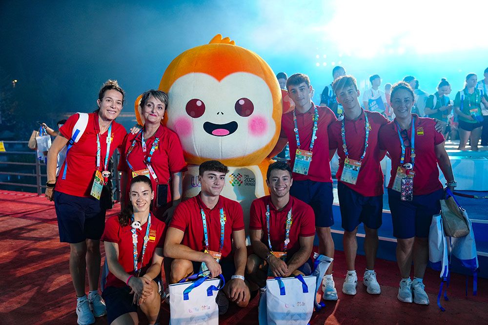 运动员在闭幕式上与本届世运会吉祥物“锦仔”合影。(图片来源:新华社)