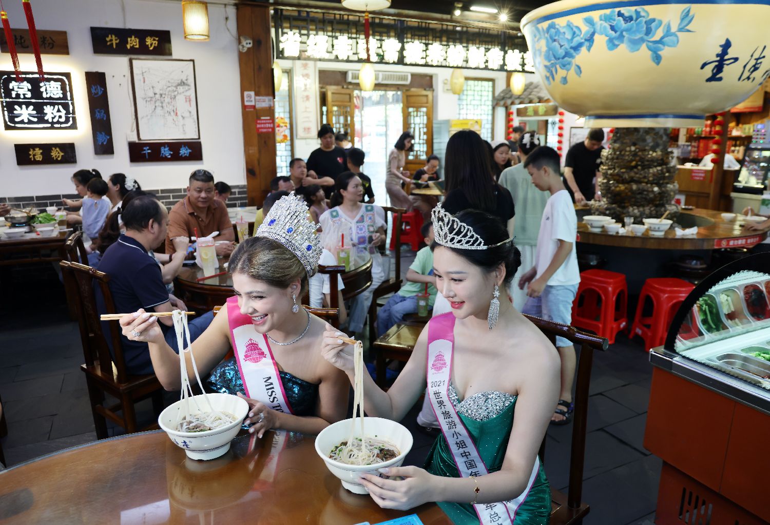 发布会后,来自巴西的2024世界旅游小姐全球总冠军伊莎贝尔与2021世界旅游小姐中国区冠军张涵钰品尝常德米粉。