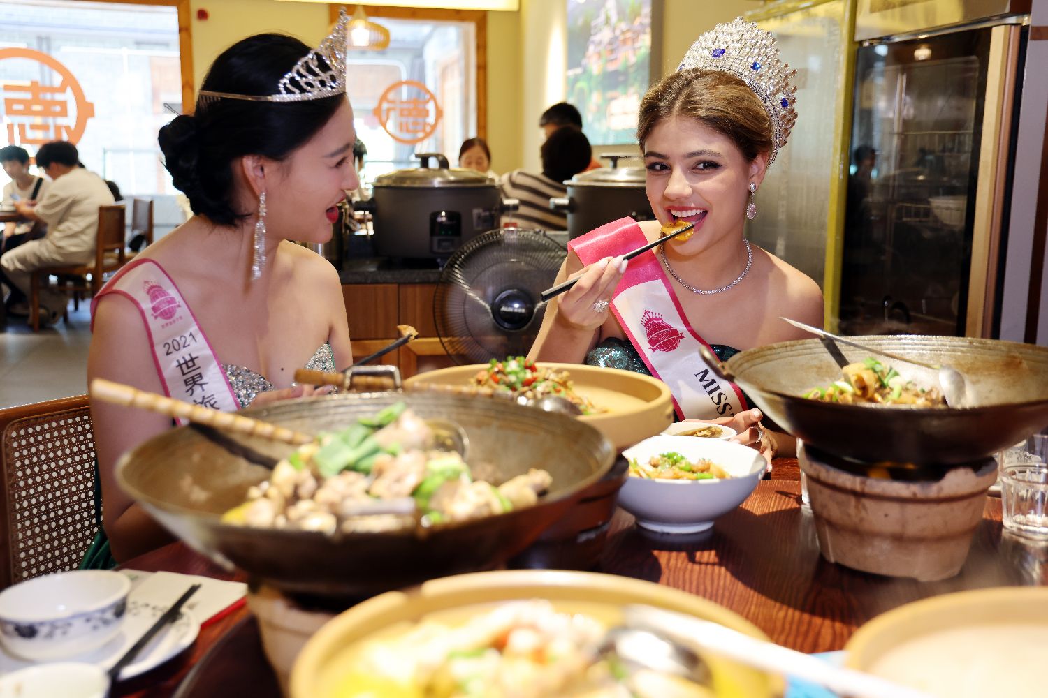 8月16日,来自巴西的2024世界旅游小姐全球总冠军伊莎贝尔与2021世界旅游小姐中国区冠军张涵钰品尝常德钵钵菜。