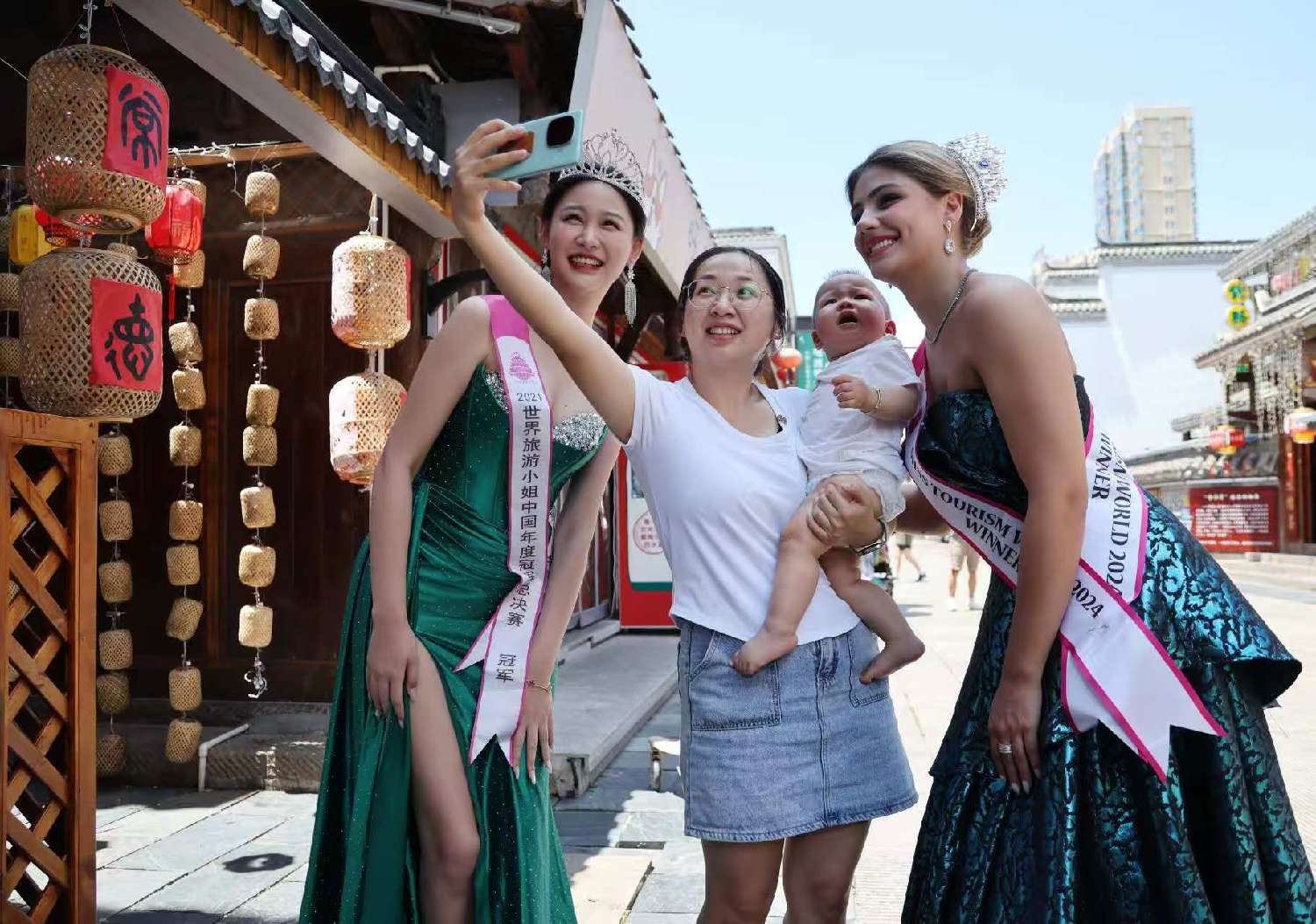 8月16日,来自巴西的2024世界旅游小姐全球总冠军伊莎贝尔与2021世界旅游小姐中国区冠军张涵钰参观游览常德河街时与当地民众合影。