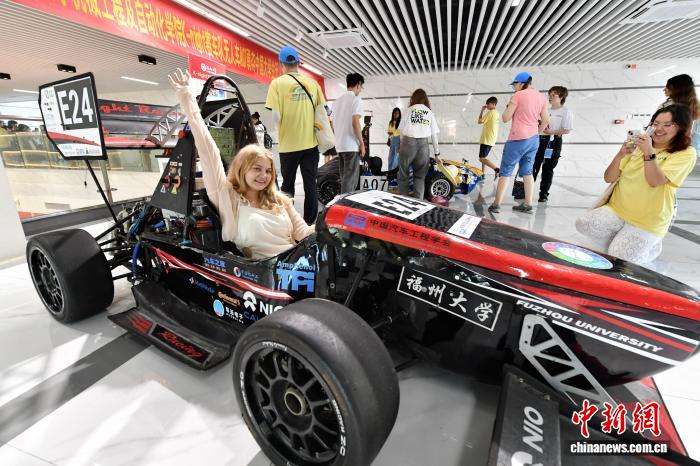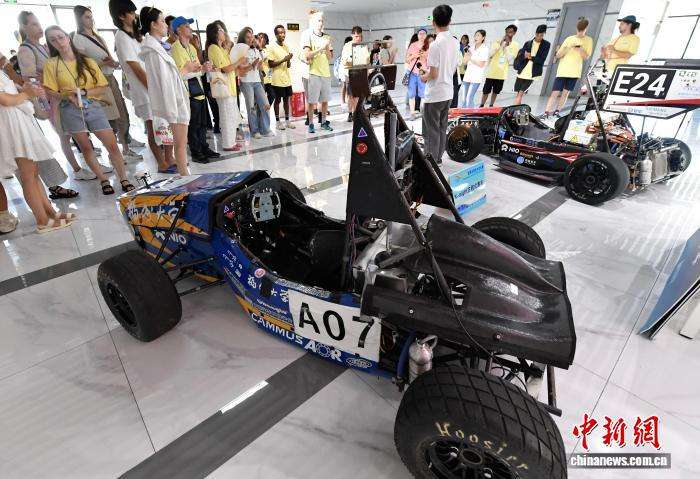 展示的方程式赛车吸引外国大学生拍照留念。(图片来源:本文图片均据中新网)