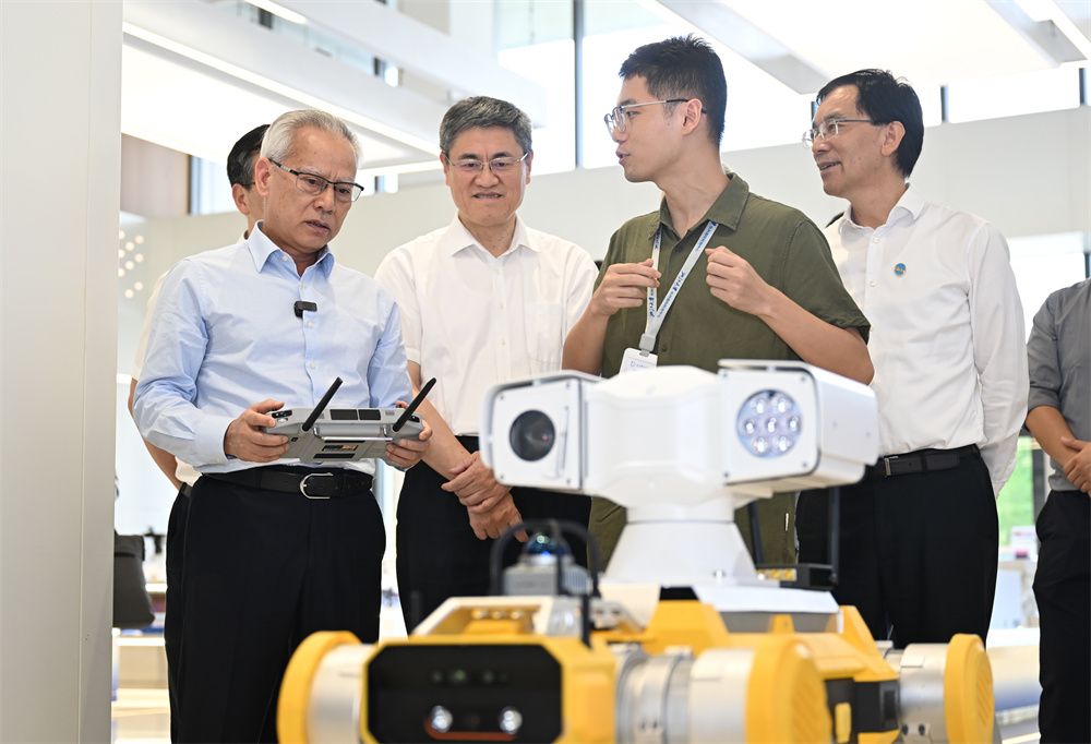 8月16日,澳门特别行政区行政长官岑浩辉(左一)在浙江大学国际科创中心体验操控四足机器人。(图片来源:中新社)