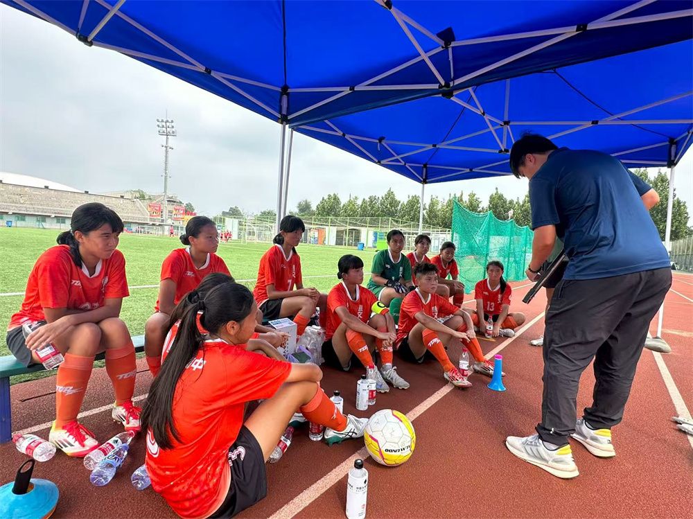 8月18日,2025年“青春同行”海峡两岸青少年足球交流赛在北京开赛。图为中场休息时,教练李绣琴为惠文女足调整战略。(图片来源:中新社)