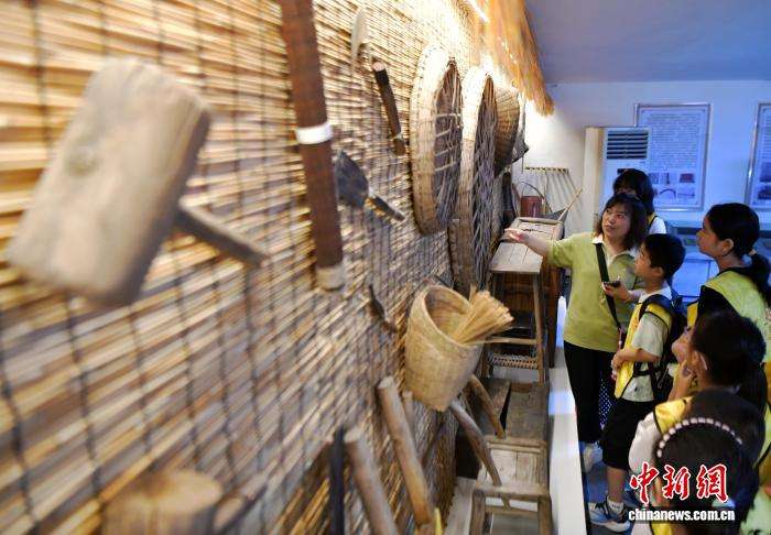 8月21日,河北省保定市竞秀区宝虹艺术博物馆,小朋友们参观传统造纸工具。