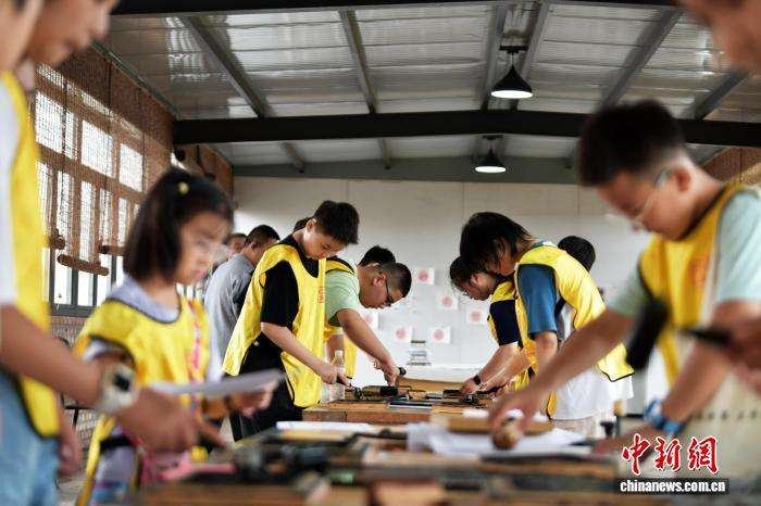 8月21日,河北省保定市竞秀区宝虹艺术博物馆,小朋友们正在体验活字印刷。