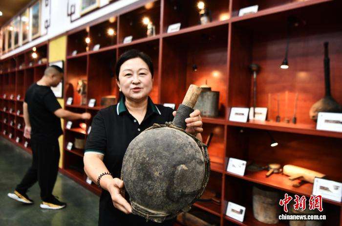 8月20日,河北省保定市竞秀区小磨香油博物馆,工作人员展示早期的香油桶。