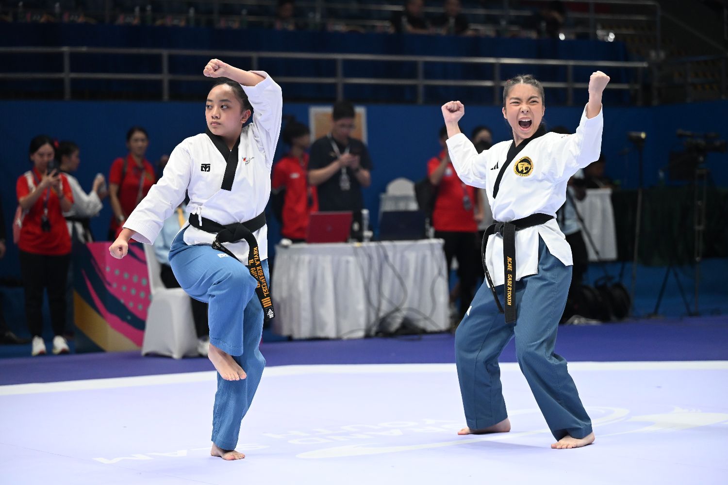 安踏杯2025跆拳道大满贯世青俱乐部联赛总决赛8月22日在成都双流体育中心举行,此项赛事吸引了来自中国、新加坡、泰国、马来西亚、蒙古国、菲律宾、中国香港等国家及地区约1500名选手参赛。图为菲律宾选手(左)与新加坡选手(右)在个人品势项目比赛中。(图片来源:本文图片均自中新社)