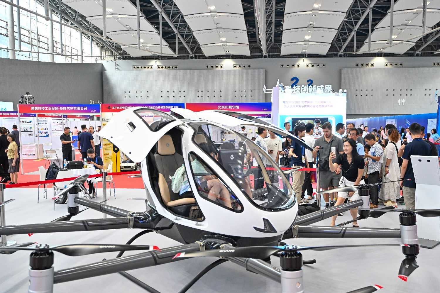 8月22日,由广州市人民政府主办的第33届广州博览会在中国进出口商品交易会展馆开幕。图为一款载人飞行器吸引观展人员。(图片来源:中新社)