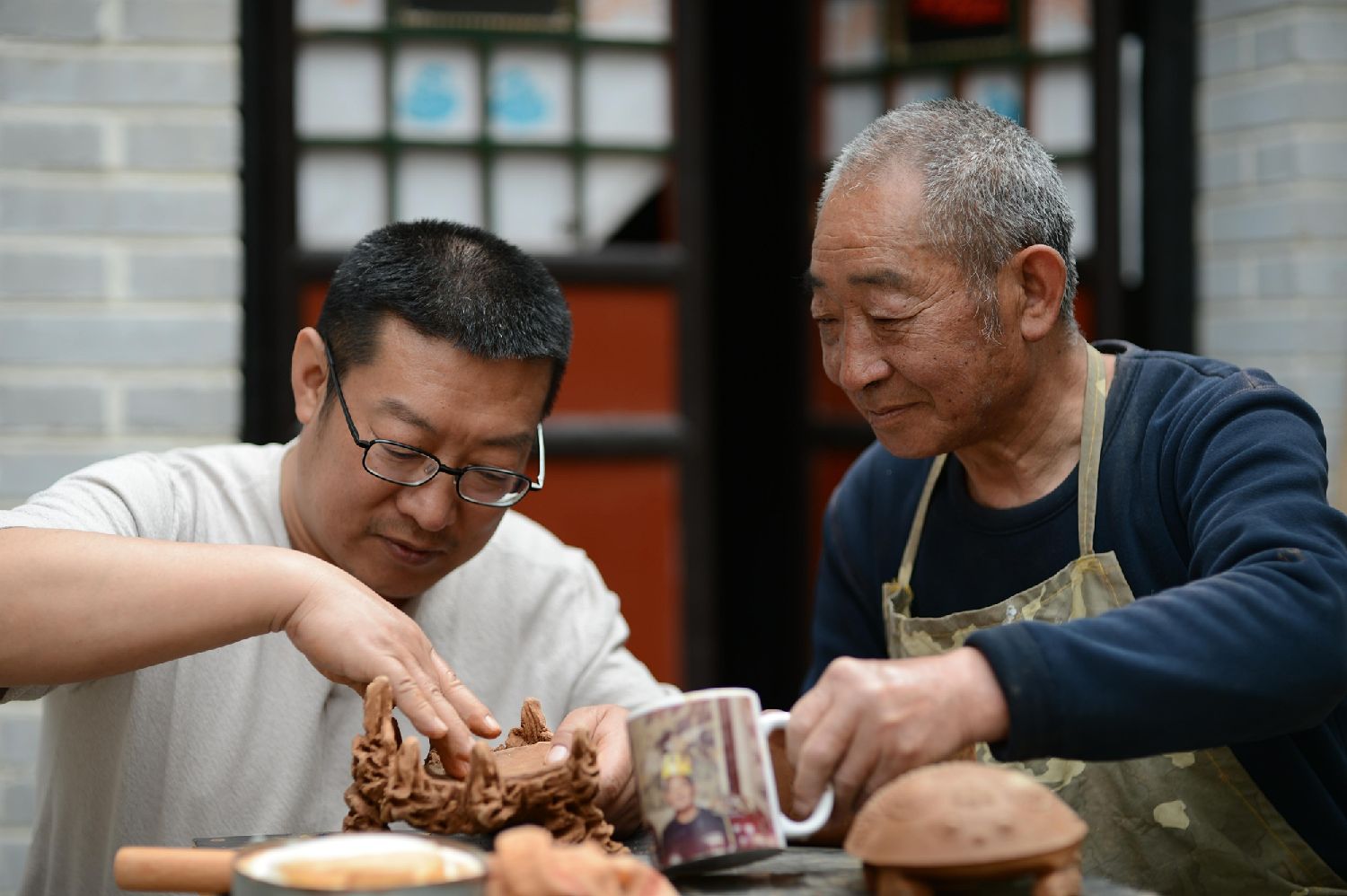 7月17日,河南三门峡,王跃泽(左)制作澄泥砚。(图片来源:受访者供中新社图)