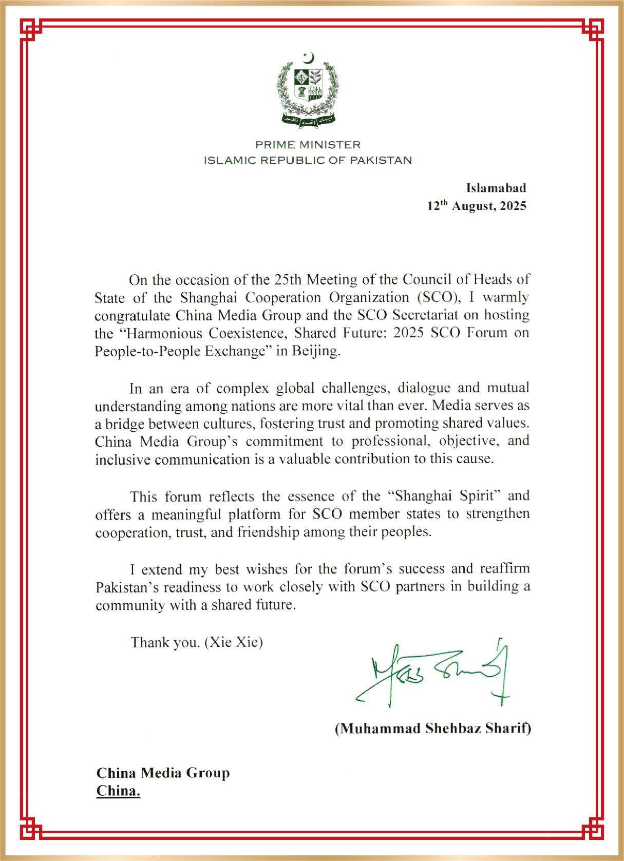 在上海合作组织成员国元首理事会第二十五次会议即将召开之际,8月25日,由中国中央广播电视总台与上海合作组织秘书处联合主办的“2025上海合作组织国家人文交流活动”在北京举行。吉尔吉斯斯坦总统扎帕罗夫、巴基斯坦总理夏巴兹致贺信,祝贺活动圆满成功。包括上海合作组织国家政治、文化、媒体等各界知名人士在内的100余位嘉宾出席活动,并见证多项上合组织国家人文交流成果发布。