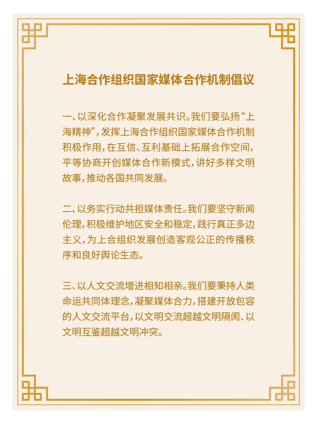 活动现场,中宣部副部长、中央广播电视总台台长慎海雄,上海合作组织秘书长叶尔梅克巴耶夫,哈萨克斯坦总统广播电视综合体总经理卡日巴耶娃,吉尔吉斯斯坦国家电视广播公司总裁季列巴耶夫,巴基斯坦《每日团结报》媒体集团总编辑法鲁克,《俄罗斯报》第一副总编辑切尔尼亚克,乌兹别克斯坦《人民言论报》副总编辑肯扎耶夫共同启动上海合作组织国家媒体合作机制,并发布《上海合作组织国家媒体合作机制倡议》。