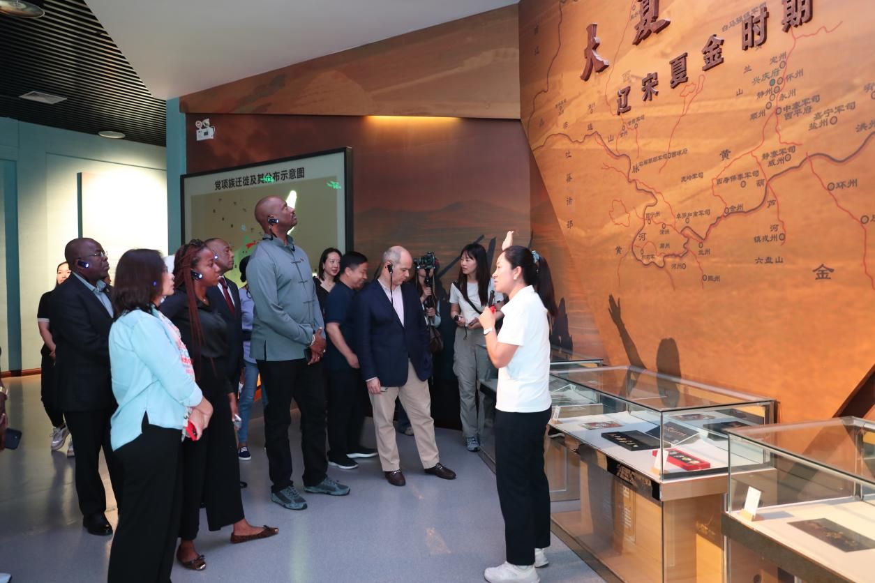 8月26日,参与2025“发现中国之美·相约神奇宁夏”活动的驻华使节及配偶参观宁夏博物馆。(图片来源:中新社)