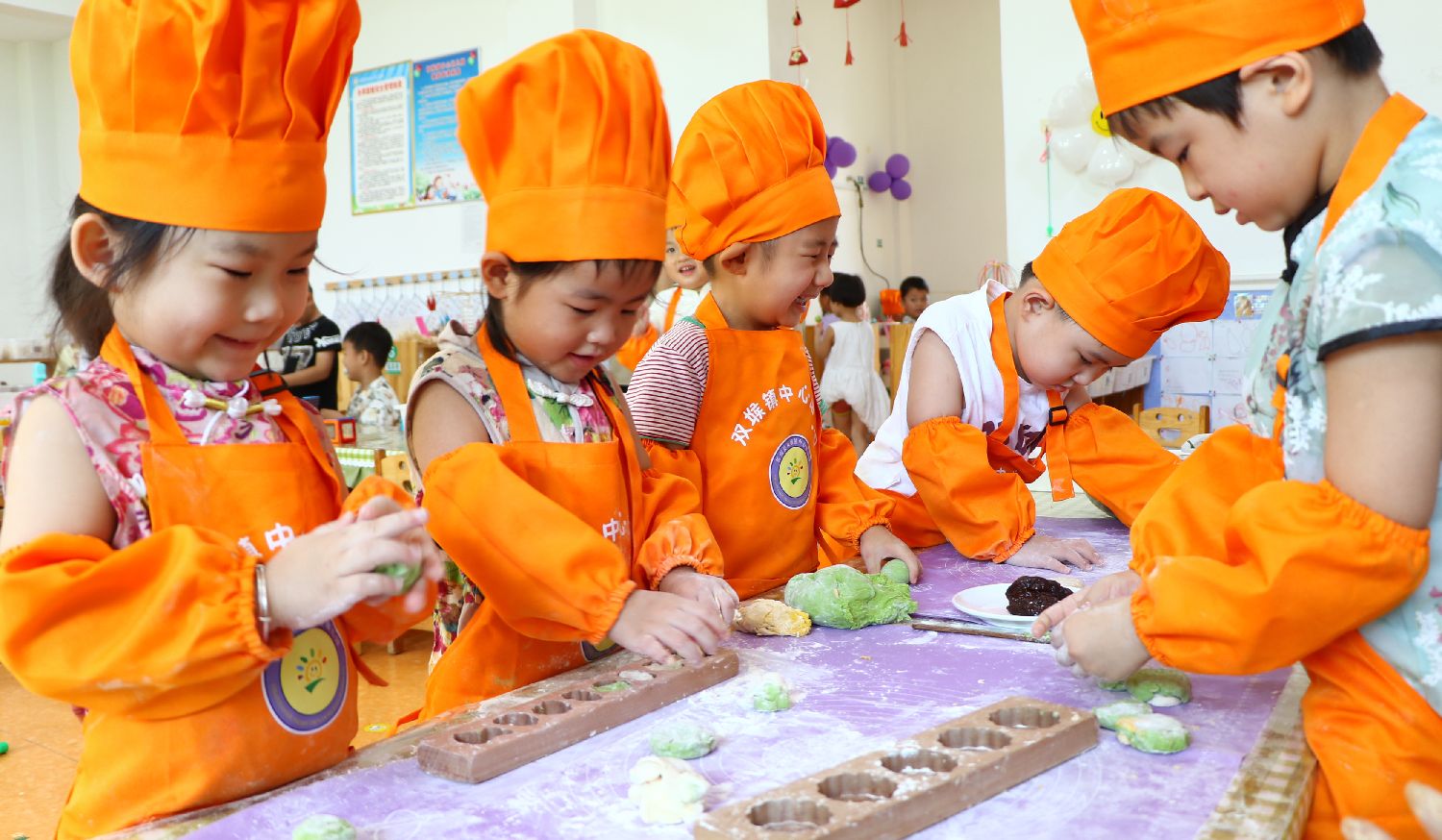 8月26日,在山东省临沂市沂南县双堠镇中心幼儿园,小朋友学做七夕巧果。(图片来源:本文图片均据新华社)