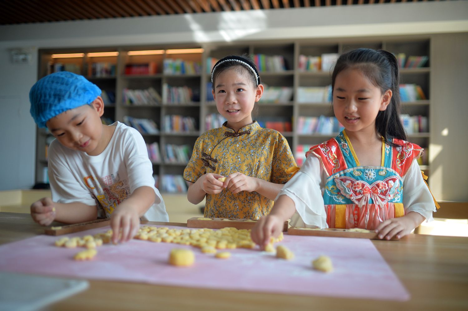 8月26日,在山东省青岛市城阳区河套街道西河套社区,小朋友学做七夕巧果。